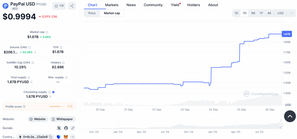 PYUSD市值已跨越18亿美元的重要关口。截至2025年9月24日,其市值还徘徊在15亿美元下方,当前的跃升使其成为市场焦点。过去7天内,这款稳定币市值增长达3.95%。数据来源:CoinMarketCap