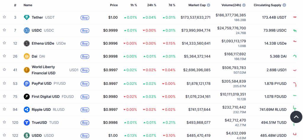 Ethena USDe以140亿美元市值位居稳定币第三,DAI(53亿美元)紧随其后。其他上榜的美元稳定币还包括FDUSD、RLUSD和TUSD。