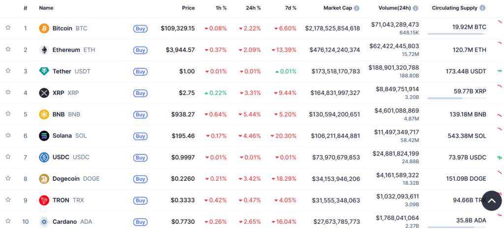 PYUSD市值增长之际,全球加密货币正面临下行压力。旗舰加密货币BTC24小时下跌2.22%,报109,329.15美元;ETH同期下跌2.09%至3,944.57美元,两者市值分别为2.1万亿美元和4760亿美元。数据来源:CoinMarketCap