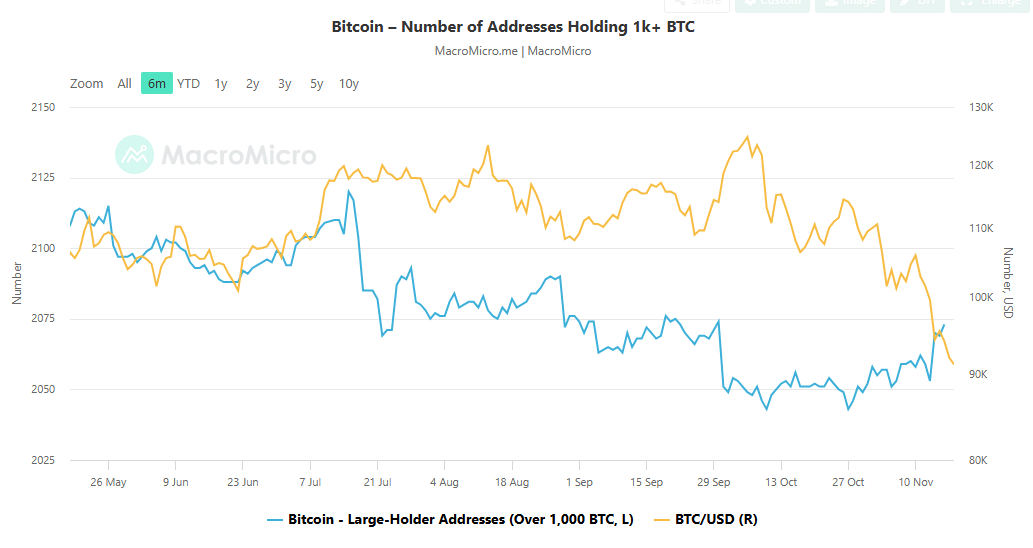 过去一周持有至少1000枚比特币的实体数量激增,逆转了此前大持有者持续抛售的趋势。与此同时,比特币价格跌至9万美元下方,导致2025年累积涨幅归零,市场普遍进入谨慎状态。