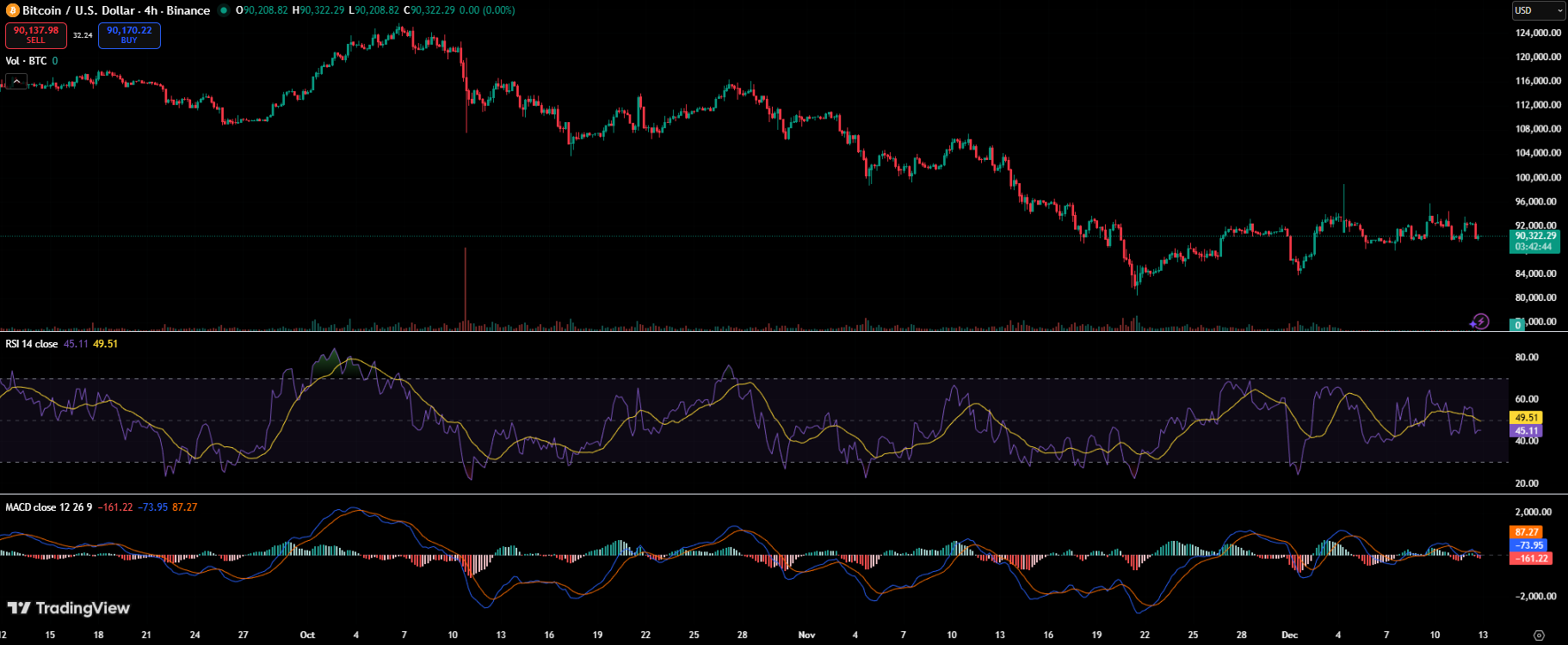 早间比特币曾短暂冲高,但在93,000美元关口下方受阻——该水平已多次压制价格反弹。随着阻力位再度生效,动能迅速逆转,推动BTC回落至近期波动区间的下轨。