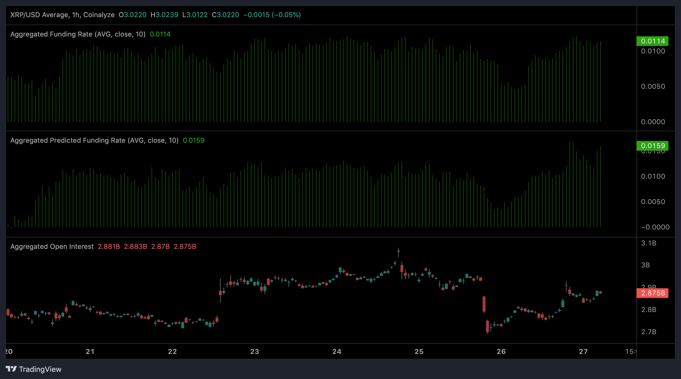 Coinalyze数据显示,交易者仍保持乐观情绪:当前资金费率为0.0114,预测费率更高达0.0159,表明多数参与者看涨并支付费用维持多头仓位。未平仓合约金额微升至28.75亿美元,显示更多交易者正通过杠杆押注上涨行情。