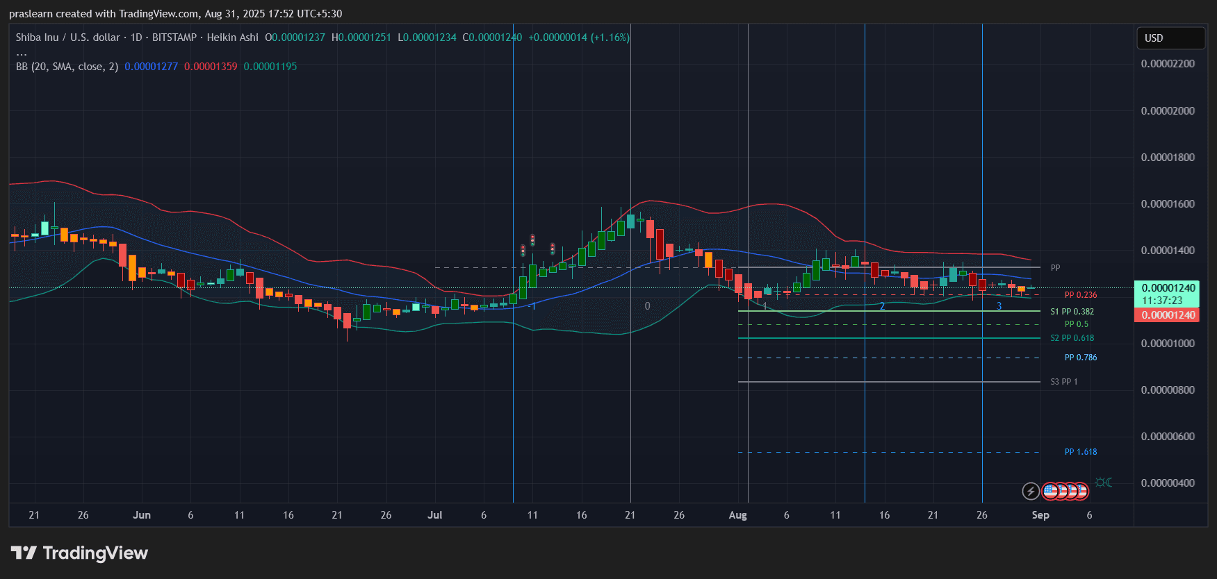 阻力位位于8月中旬高点0.00001350附近,明确突破该水平可能打开通往0.00001600的路径。下行方面,0.00001195和0.00001100附近的斐波那契水平构成支撑,失守这些区域可能导致SHIB滑向0.00001000。