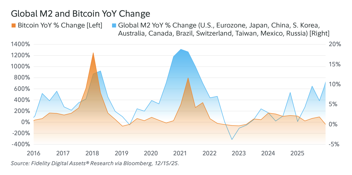 当前的局势因多重宏观顺风因素而看涨,包括不断增长的全球流动性(以全球M2供应量为跟踪指标)以及美联储量化紧缩政策的结束。Bitwise资产管理公司全球研究主管Matt Hougan在其最新报告中表示:“从历史上看,比特币的牛市与全球流动性增加的时期相吻合。”他补充道:“随着全球新的货币宽松周期开始以及美联储QT计划的结束,我们很可能会看到这一增长率在2026年全年持续上行,这对比特币价格是一个积极的催化剂。”