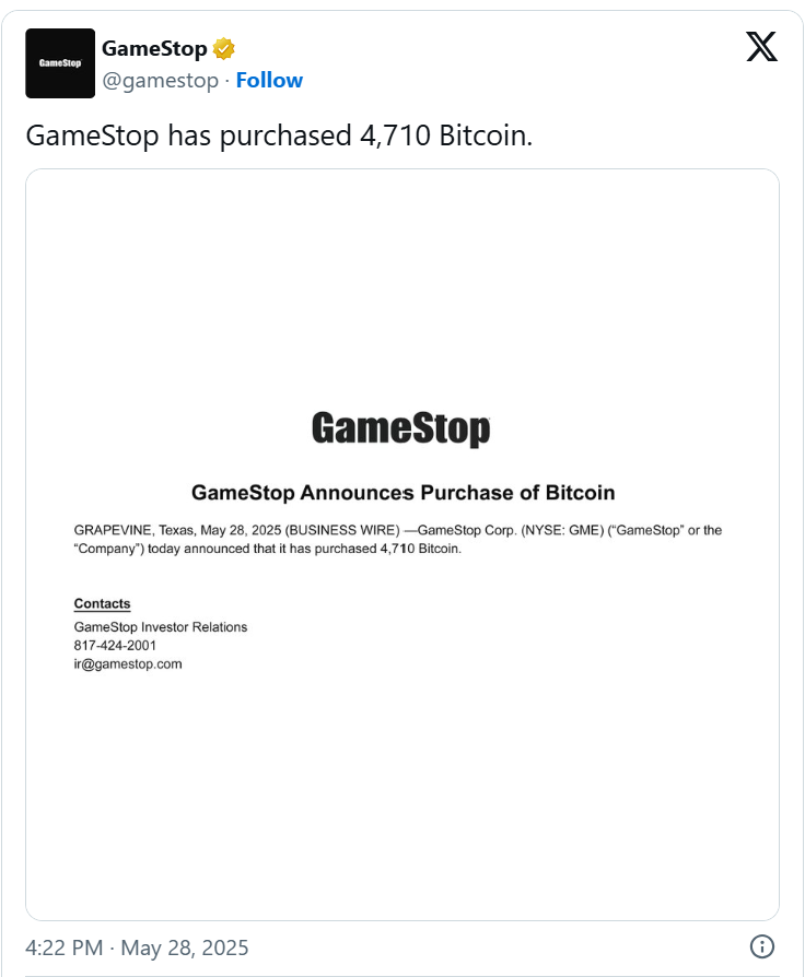 美国视频游戏及周边零售商GameStop Corp(NYSE: GME)正式加入比特币储备资产持有企业行列。该公司周三宣布购入4,710枚比特币,作为其将BTC纳入国库储备资产新战略的一部分。消息公布后,GME股价在今日盘前交易时段跳涨超4%,过去一周累计涨幅已突破20%。