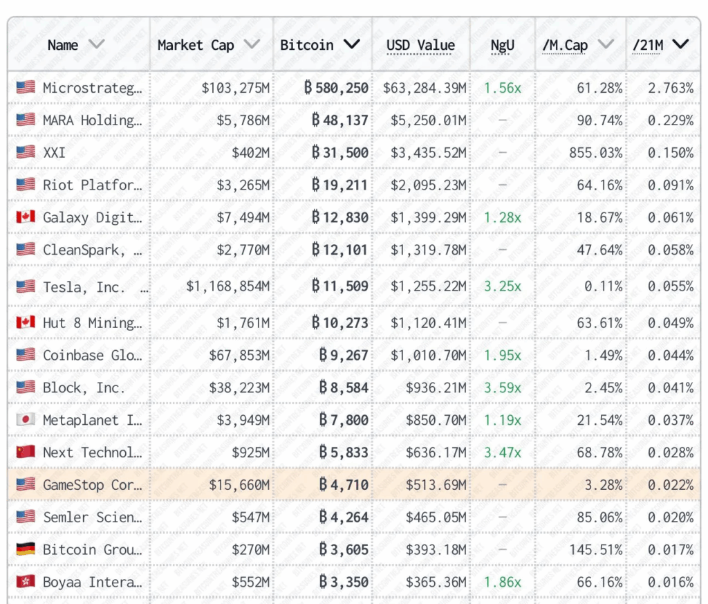 自2023年9月Ryan Cohen出任CEO以来,公司进行了重大战略调整。这位掌舵人在董事会通过比特币储备决策中发挥了关键作用。GameStop计划通过发行13亿美元债务融资来实施比特币储备战略,目前其比特币持仓市值仅占公司总市值的3.28%,在持有比特币的上市公司中排名第13位。