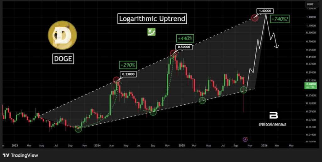 Bitcoinsensus分享的图表显示,狗狗币自2023年初以来一直在一个大型上升通道内交易,这种技术形态被称为对数上升趋势。这意味着随着价格攀升,每次主要上涨幅度会变大,但形成时间也会延长。
