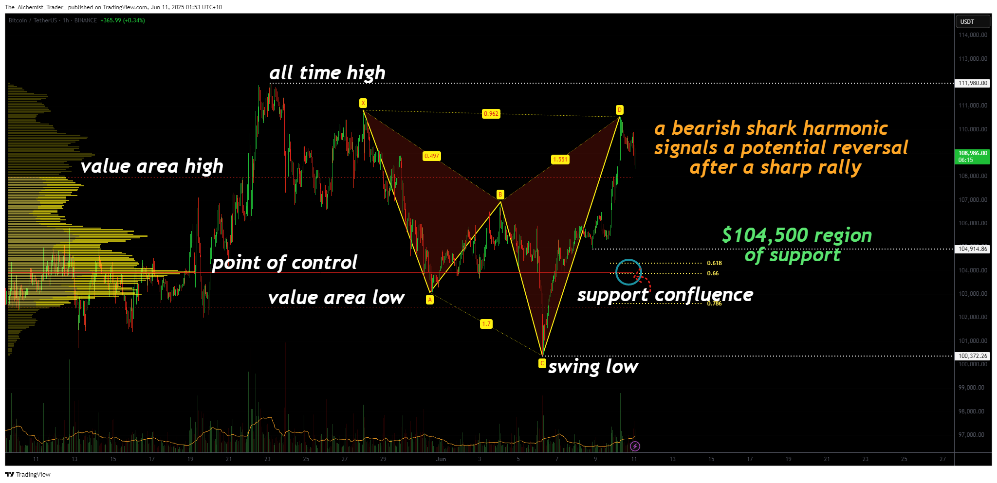 比特币日内图表最新确认的看跌鲨鱼谐波形态,预示着短期内可能出现回调。随着价值区域高点(VAH)面临压力,且成交量指标显示缺乏强劲买方支撑,比特币可能正酝酿向更深的成交量支撑区域进行健康回撤。