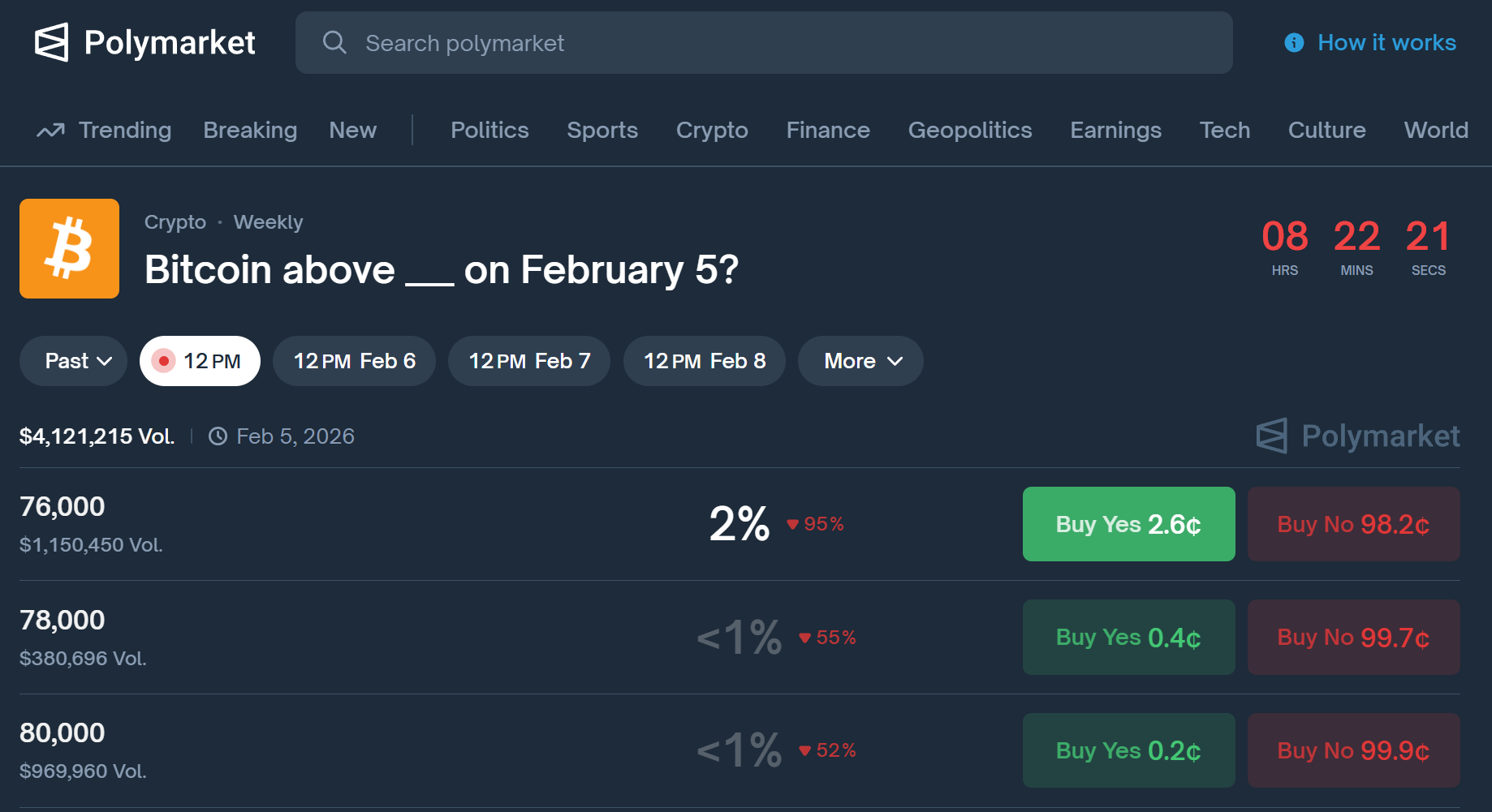 Polymarket数据显示比特币二月跌破7万美元概率达74%,市场空头情绪浓厚