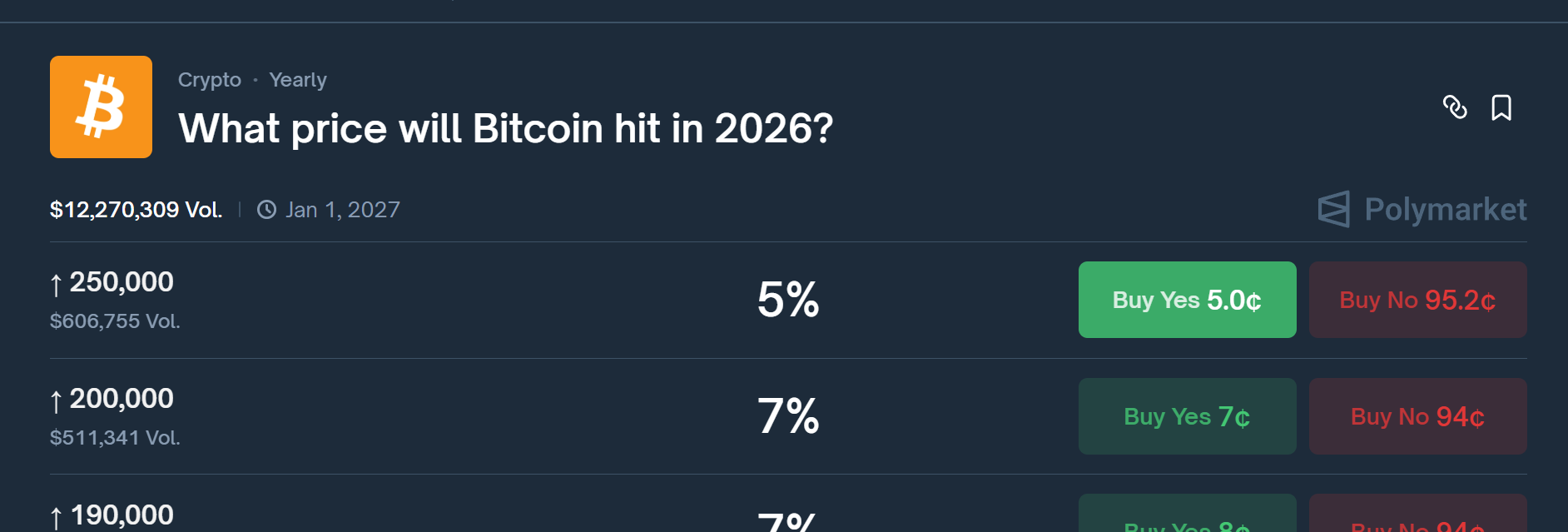 从预测市场视角看,集体智慧与华尔街加密倡导者长期鼓吹的“数字资产即将复苏”的看涨叙事形成鲜明对比。例如华尔街知名分析师Tom Lee去年十一月曾预测比特币可能反弹至15-20万美元区间,但该预期并未实现。尽管渣打银行、伯恩斯坦等机构去年末下调了预测,它们仍预计比特币今年底将显著上涨,两家机构均维持约15万美元的年终目标价位。