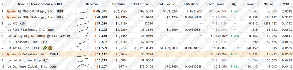 值得注意的是,就在该公告发布前一天,Metaplanet刚增持了1,111枚BTC,使其比特币总持仓达到11,111枚。