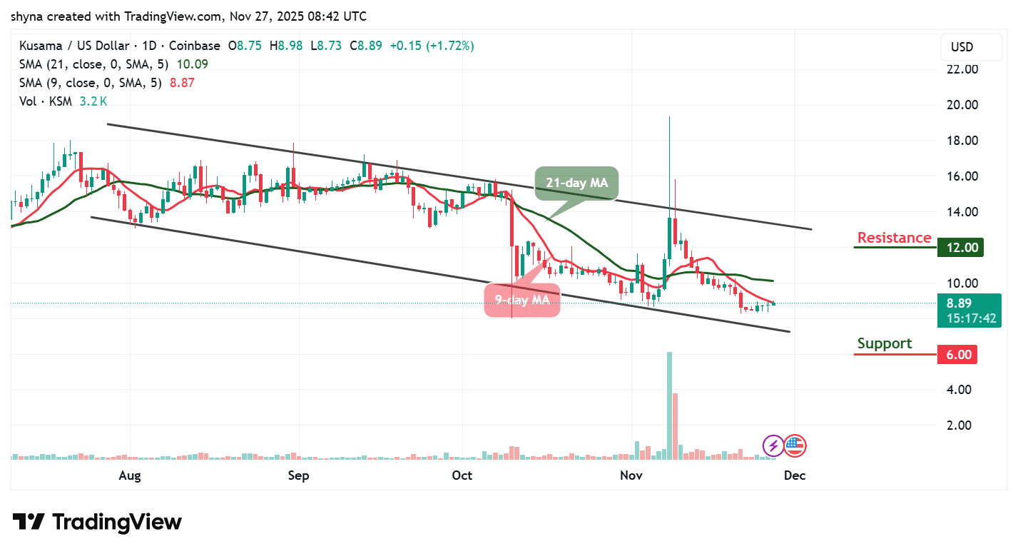 截至发稿,KSM/USD交易于8.89美元附近,呈现温和看涨动能。价格正尝试从下降通道下轨反弹,9日均线(8.87美元)与21日均线(10.09美元)逐渐收敛,预示多头可能重掌主动权。若日线收于短期阻力上方,或标志局部反转启动。但市场仍需持续放量及更高时间框架确认,才能验证长期趋势转变。