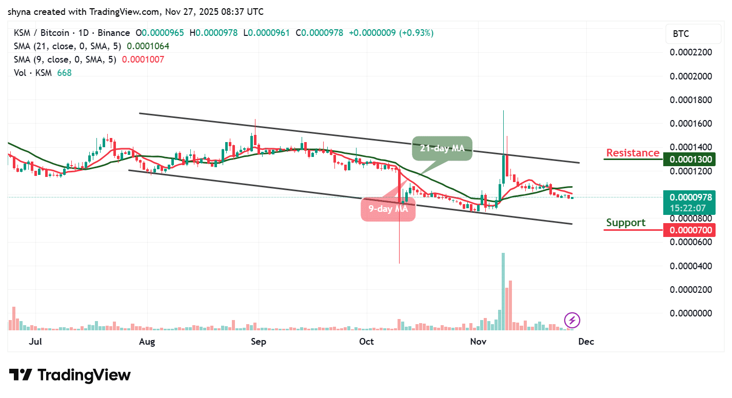 草间价格预测显示,KSM在经历长期下跌趋势后,正逐渐显现早期复苏迹象。该资产一直在下降通道内盘整,但近期的价格走势表明买盘动能可能正在回归。