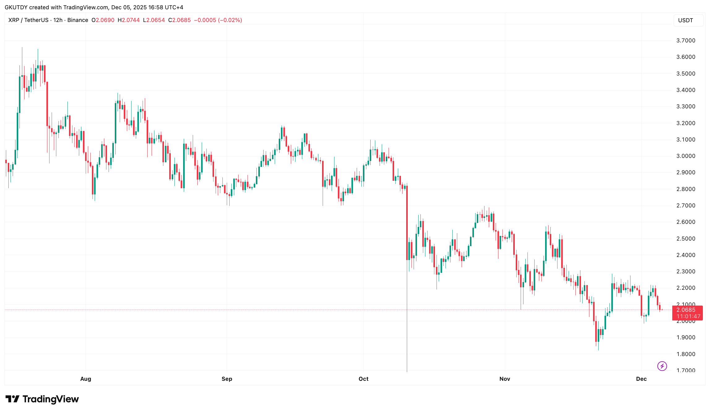 然而这个水位远高于当前市价。XRP现报2.07美元附近,这意味着空头尚有约10%的缓冲空间才会感受到压力。他们目前并无紧迫风险,只是存在明确的防御底线。