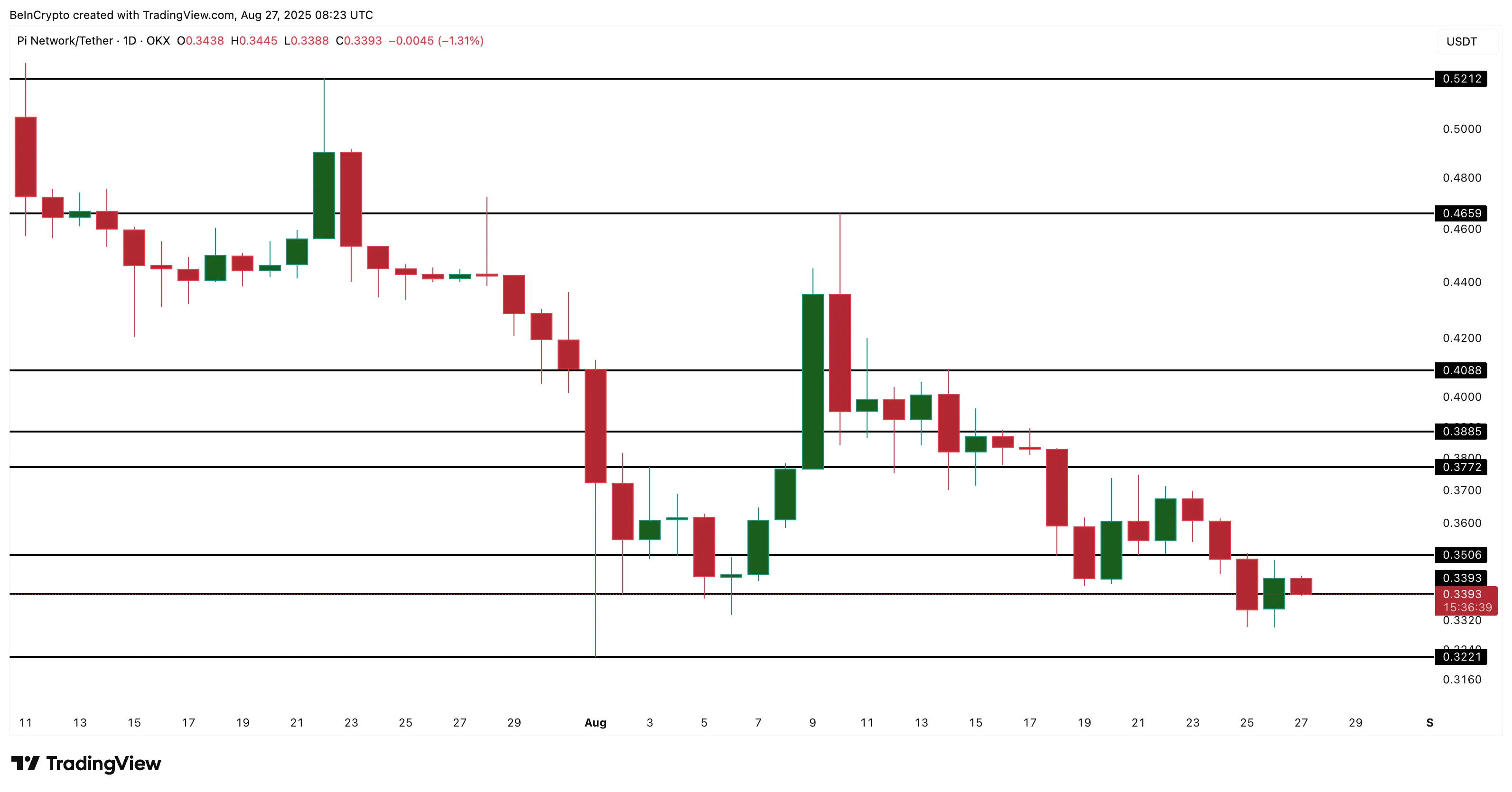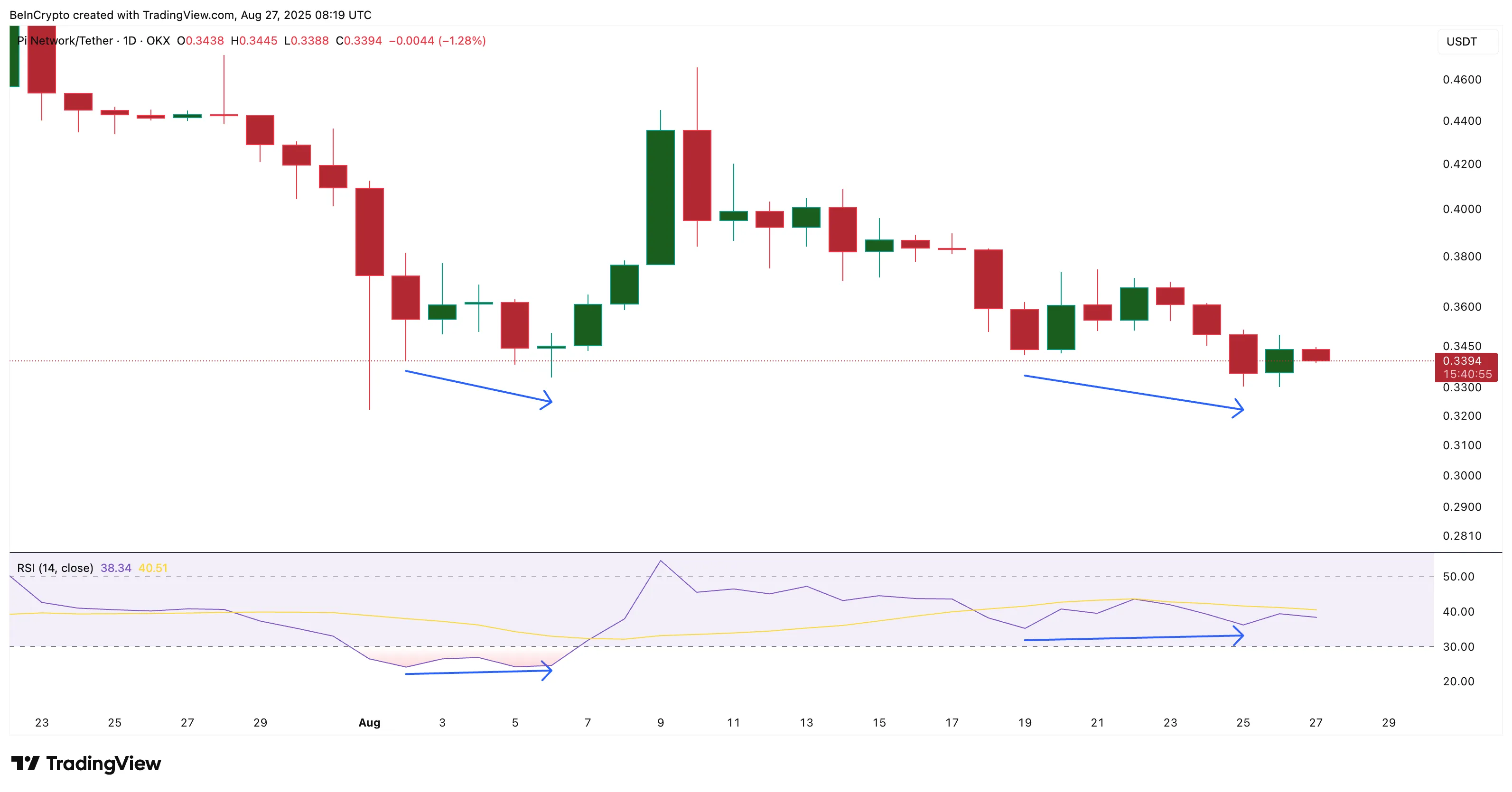 价格走势同样反映这种谨慎乐观情绪。Pi币近期坚守0.33美元关键支撑位。若看涨背离生效,首个上行目标将指向0.46美元——这正是上次背离驱动涨势中测试过的水平,较当前价位约有40%涨幅空间。