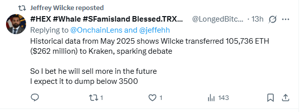 历史数据显示,威尔克曾在8月向Kraken存入价值922万美元的ETH,其链上转账记录显示多次大额操作。特别值得注意的是,他此前曾转出价值2.62亿美元的ETH,但市场推测这些资产被分散至多个钱包而非公开抛售。然而威尔克近期在社交媒体转发"未来将继续减持"的相关言论,加剧了市场对其投资策略的讨论。