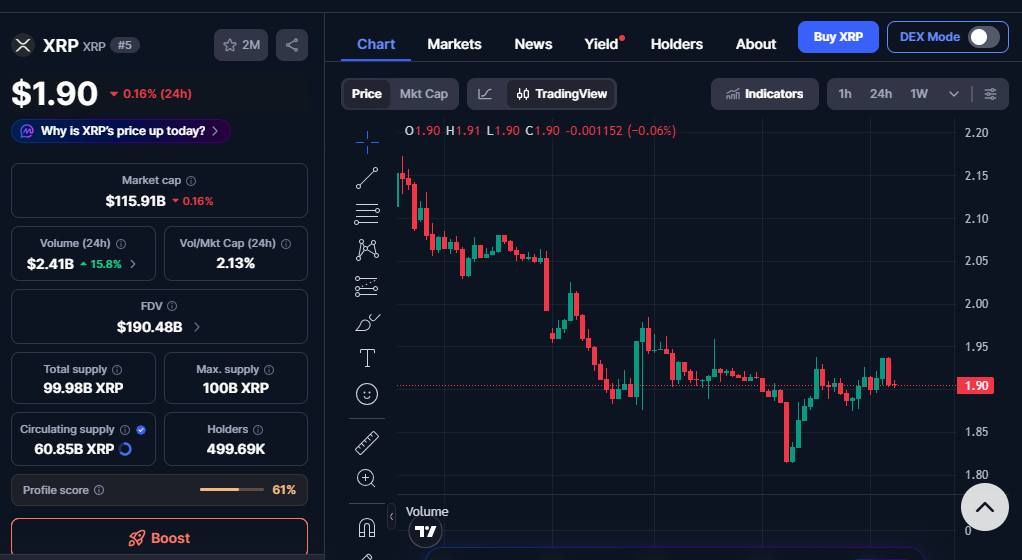 与此同时,根据广泛关注的定价来源,XRP价格在1月下旬仍维持在1.9美元左右。这使得最新XRP价格预测的焦点发生了转移。它不再仅仅关乎人们愿意相信的数字,而更多关于市场需要满足何种条件,才能使这样的结果看起来具备可能性。