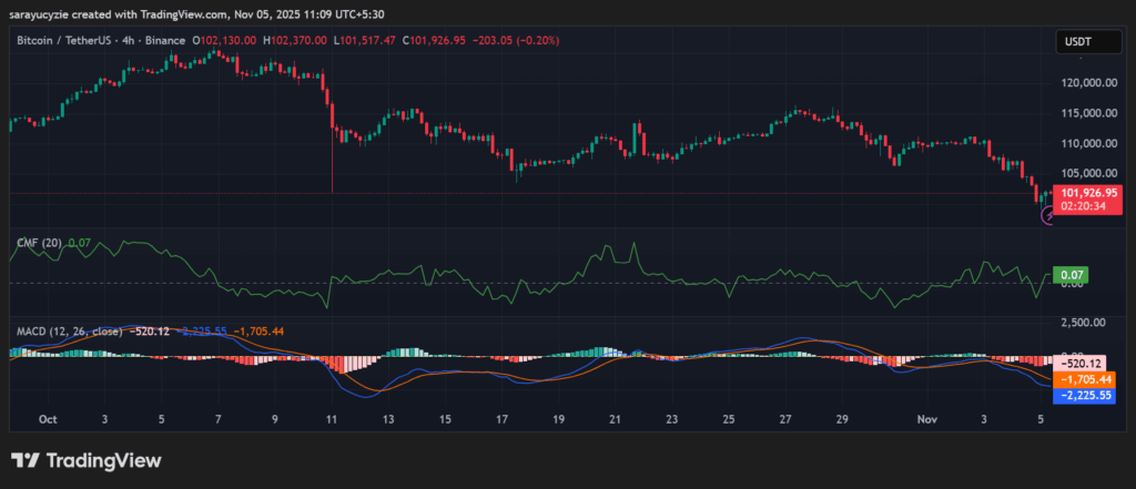 值得注意的是,BTC资金流指标(CMF)当前值为0.07,表明市场存在温和买盘压力。虽然这并非强烈看涨信号,但显示出资金正在积累。特别需要关注的是,若该指标跌破0值,则可能暗示抛压加剧。
