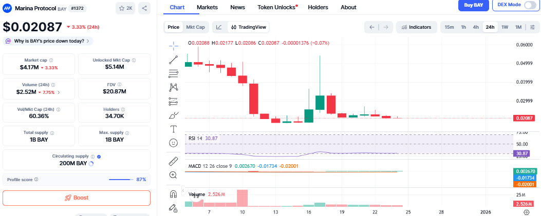 过去24小时内,BAY跌幅达3.33%。受加密货币市场整体疲软影响,该代币周内累计下跌约44%。
