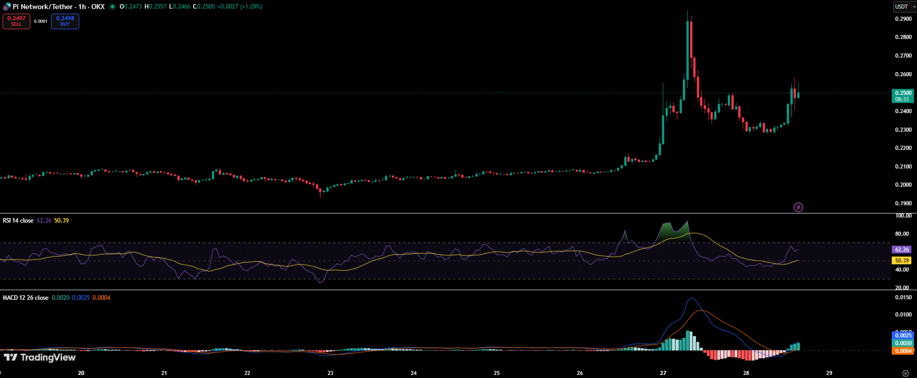 1小时图表进一步确认了突破走势。经过一段时间的积累,Pi的价格在成交量增加和RSI高于60的支持下,跃升至0.25美元上方。MACD柱状图也转为正值,显示随着买家重新掌控局面,动能正在增强。