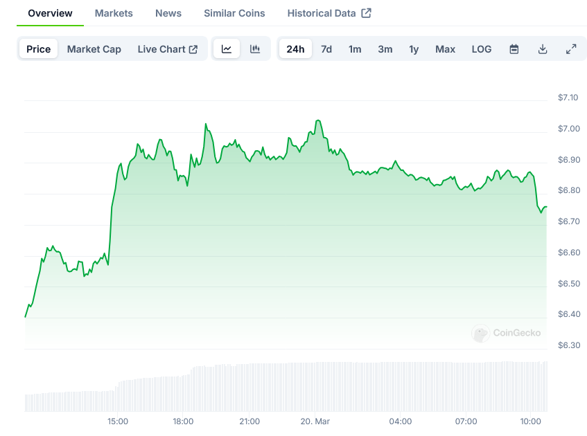 UNI代币当前交易价格约为6.80-7.01美元,交易量在此期间飙升超过200%。技术指标显示看涨信号,移动平均线收敛发散(MACD)已越过信号线,表明买压增加。