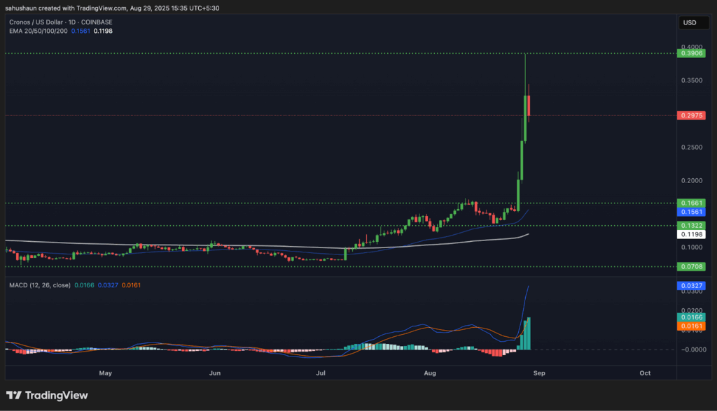 Cronos(CRO)价格在遭遇0.400美元阻力位强烈回落后,正面临看跌压力。过去24小时内,CRO价格下跌16%,显示出空头主导的市场格局。从日线技术图表来看,该代币已进入回调阶段。据CMC数据显示,CRO近24小时交易量同步下降35%,表明投资者正在高位获利了结。尽管近期出现回调,但该山寨币在过去几个月中表现亮眼,从0.10美元附近启动惊人涨势,最高触及0.40美元,累计涨幅达300%。