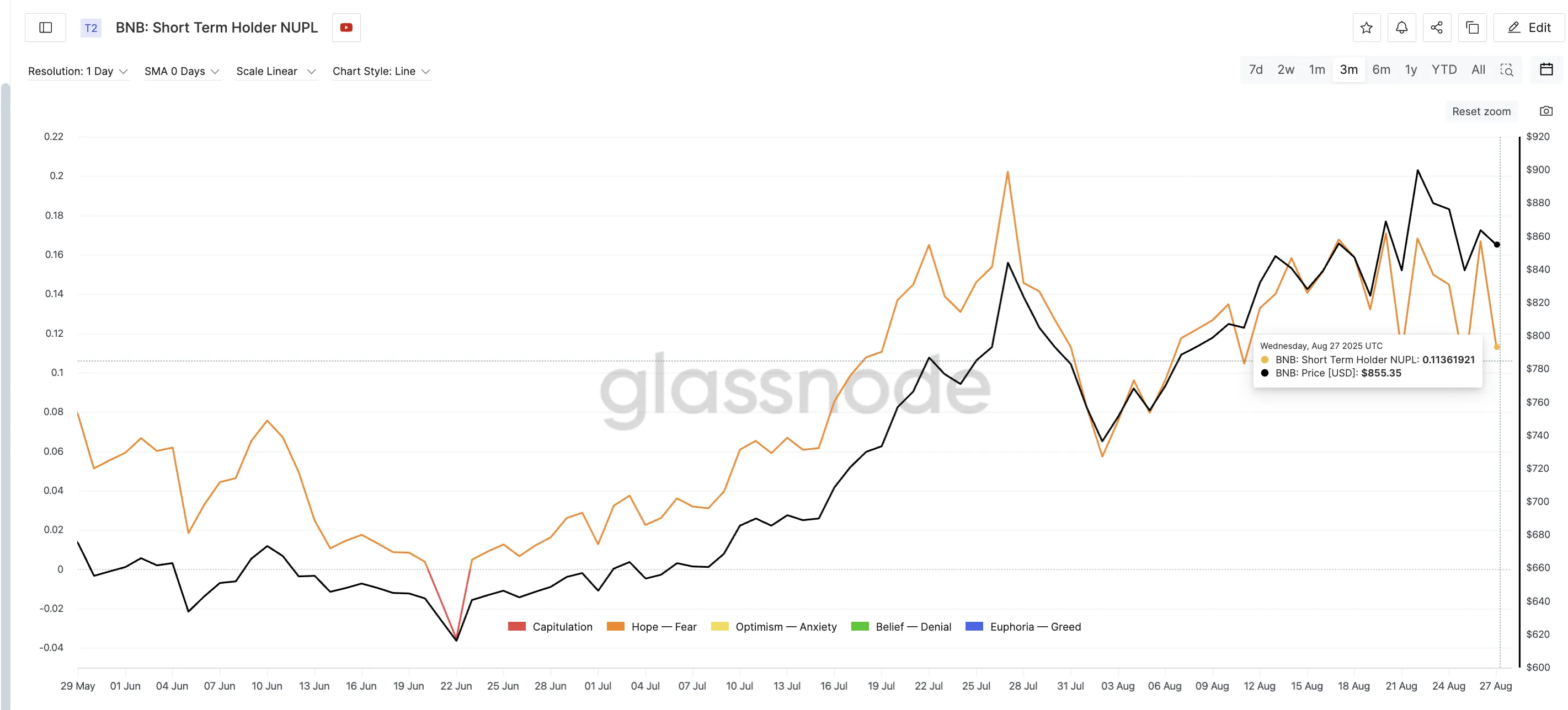 8月22日价格触及899美元峰值时,短期NUPL值为0.16,表明多数投资者仍处于盈利状态。但到8月27日,该指标骤降至0.11,尽管价格仅回落约5%至855美元。这种失衡现象显示,新进持有者的利润收缩幅度远超价格波动,意味着持有超额收益的交易者减少,获利抛压随之降低。这种转变往往能稳定市场——随着抛售压力缓解,买方继续积累筹码。