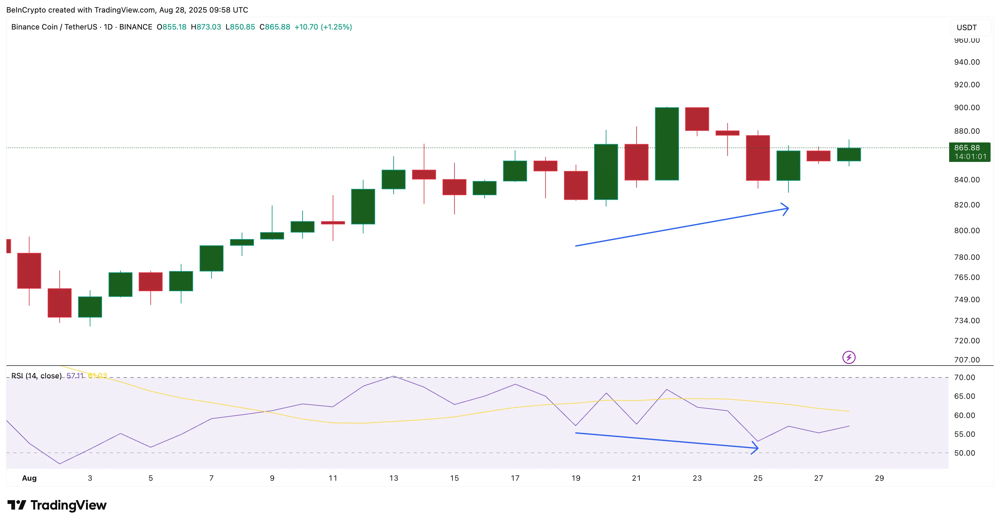相对强弱指数(RSI)同样释放积极信号。8月19日至25日期间,BNB价格形成更高的低点,但RSI却呈现更低的低点,这种被称为"隐藏看涨背离"的形态反映了买卖力量的博弈:即便动能指标走弱,买家仍提前入场阻止价格深度回调。