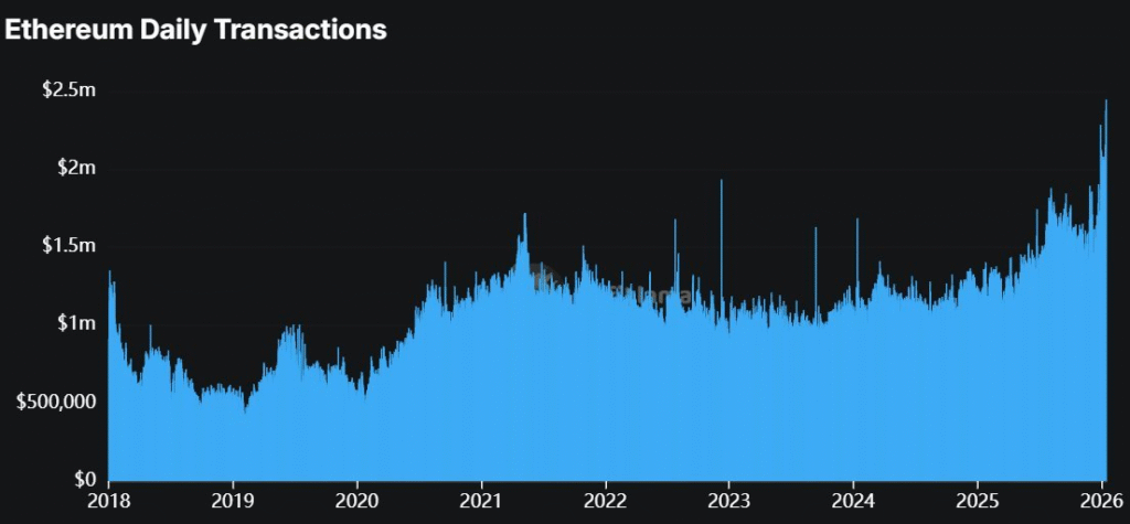 从近期数据可以看出,这一增长态势十分明显——链上活动在整个2025年持续上升,并延续至2026年初。这一增长凸显了以太坊网络的持久吸引力,以及对去中心化应用和其他以太坊生态服务的需求日益旺盛。