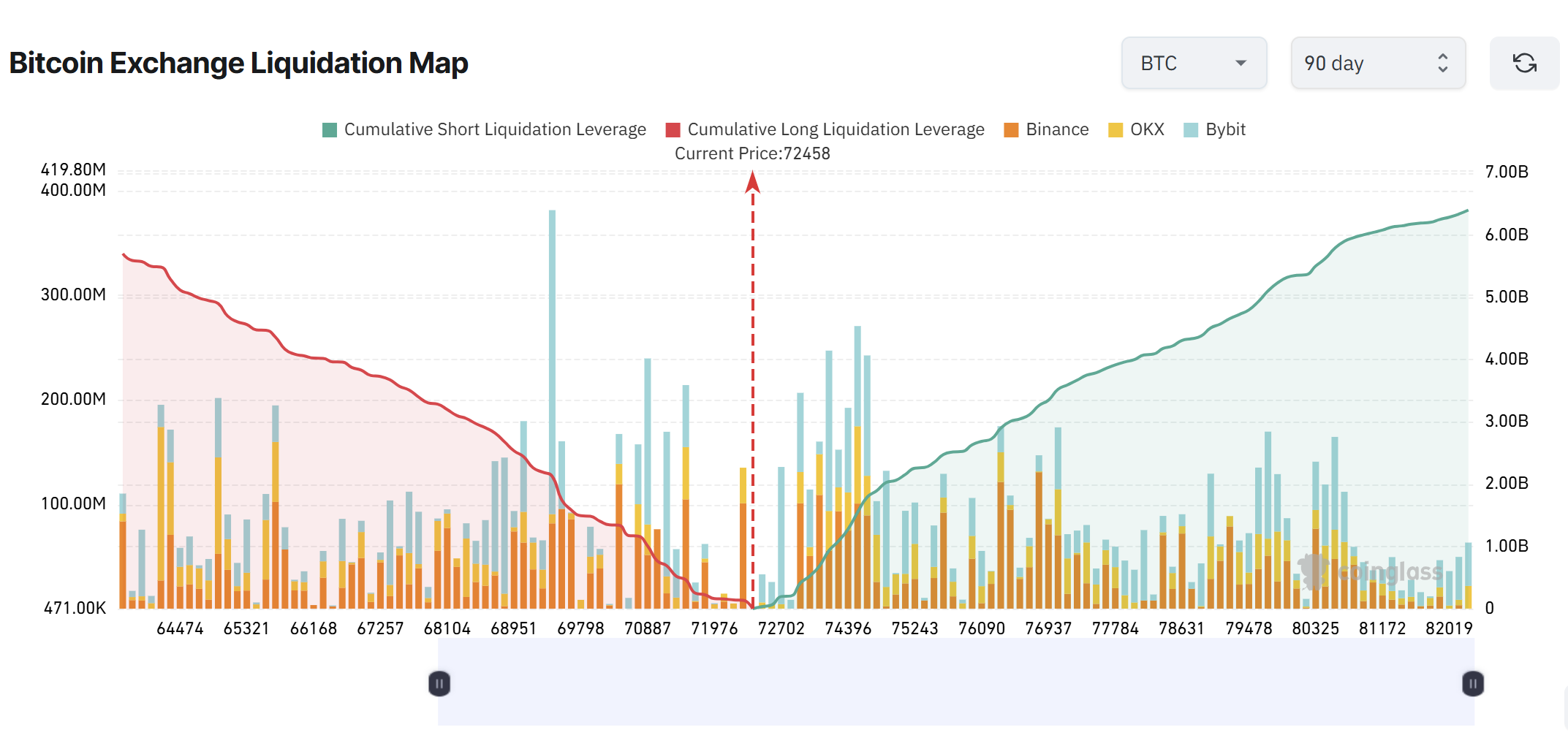 若比特币能稳定在74,000美元上方,价格将重新进入流动性密集区域。清算热力图显示约19亿美元的杠杆多头头寸集中在75,000美元略上方,当比特币寻求更高流动性区域时,该区域可能形成价格吸引力。