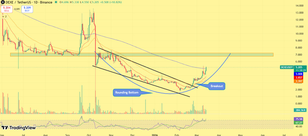 DEXE价格已确认突破持续数月的下降楔形形态。图表显示,代币在长期下行趋势中逐步构筑圆弧形积累基底,这类结构通常意味着卖压减弱而买方开始在低位吸筹。