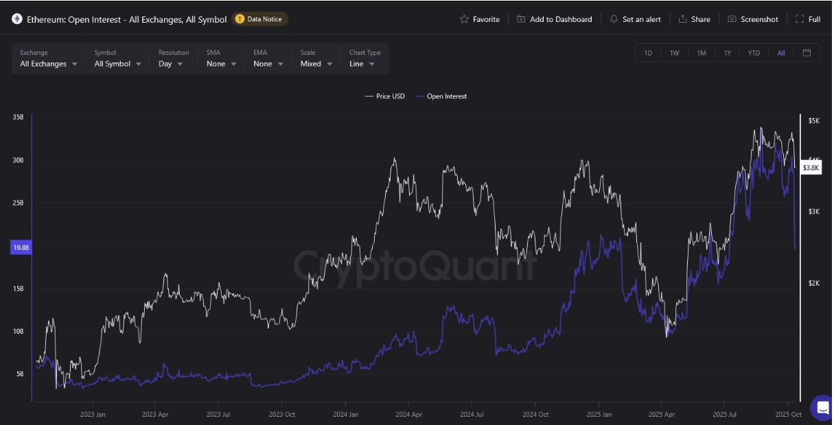 以太坊闪跌至3,510美元引发市场恐慌,但分析师视其为长期买入机会。当前价格已回升至3,830美元附近,显示低位存在大量吸筹。衍生品数据显示未平仓合约在价格下跌时持续增加,表明交易者正在建立新头寸,这种态势通常预示投资者信心恢复前的反弹阶段。