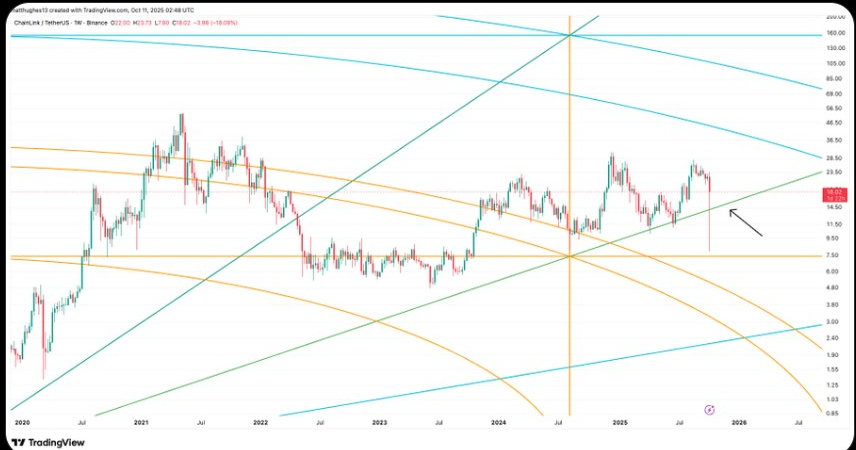 Chainlink(LINK)24小时内暴跌21%,从22美元跌至17.5美元附近。尽管抛售持续,分析师发现LINK已成功回测长期45°趋势线——该结构历史上曾支撑多次大幅反弹。