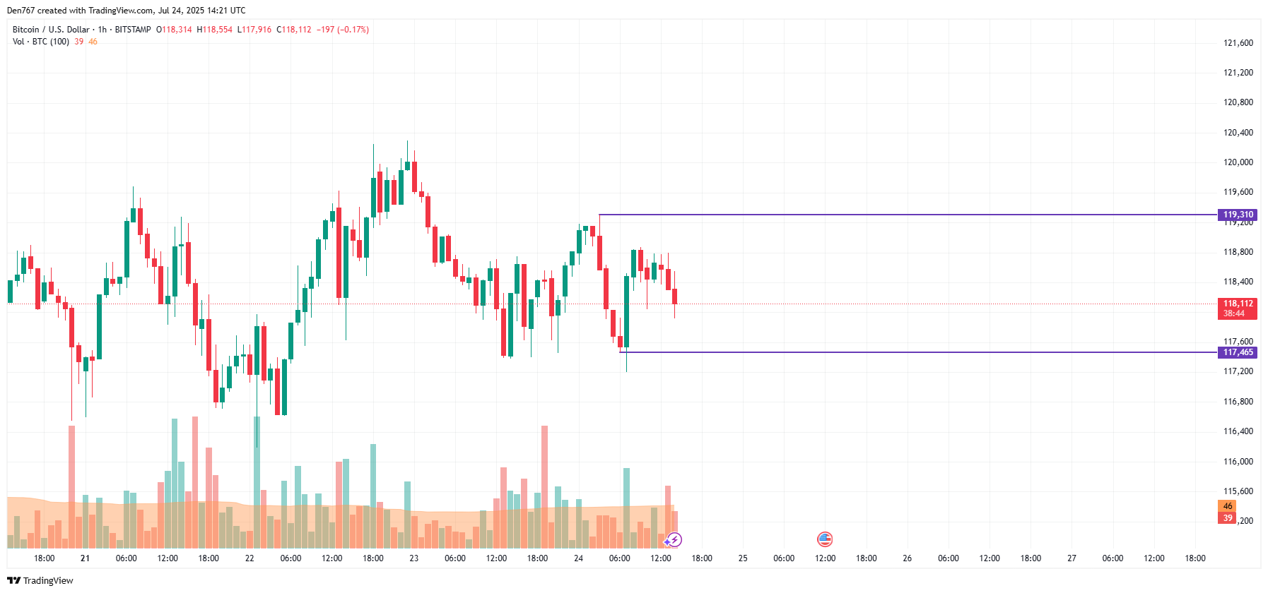 在小时线图表上,BTC价格正回探117,465美元的局部支撑位。若多头未能取得主动权,预计明日或将测试117,000美元关口。