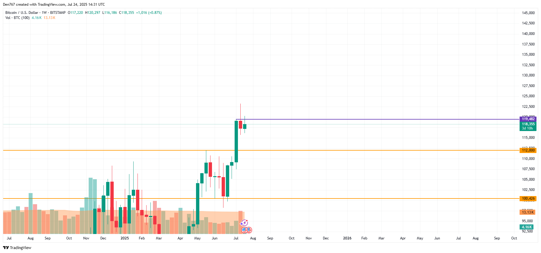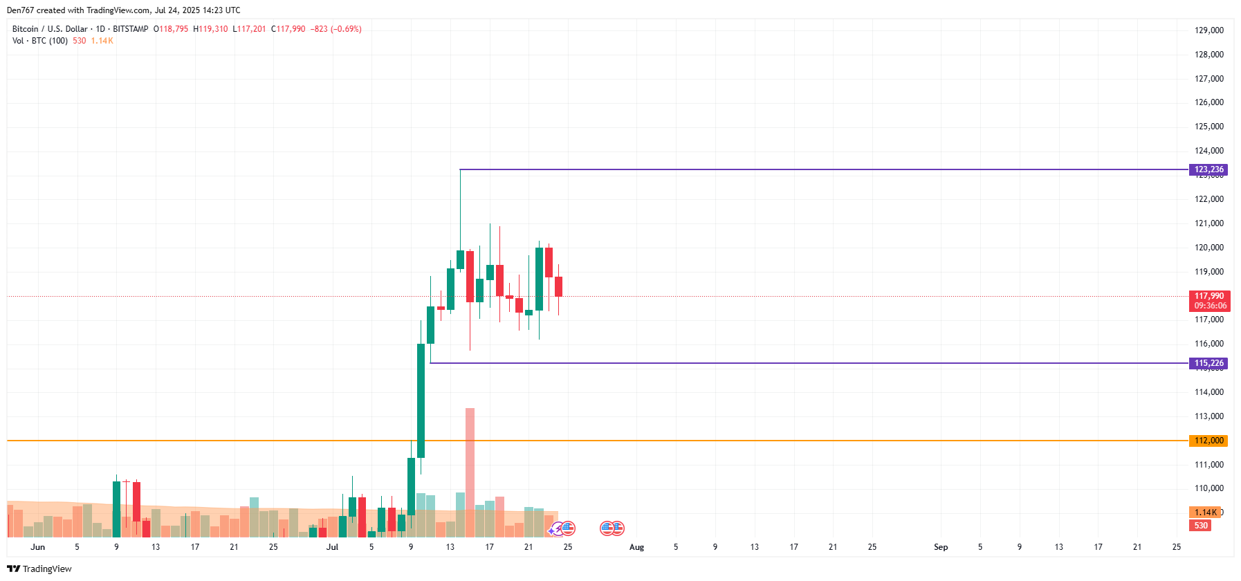 中期走势方面,BTC价格再次从119,482美元阻力位回落。若收盘价远离该关键位,预计将下探至112,000美元最近支撑位。