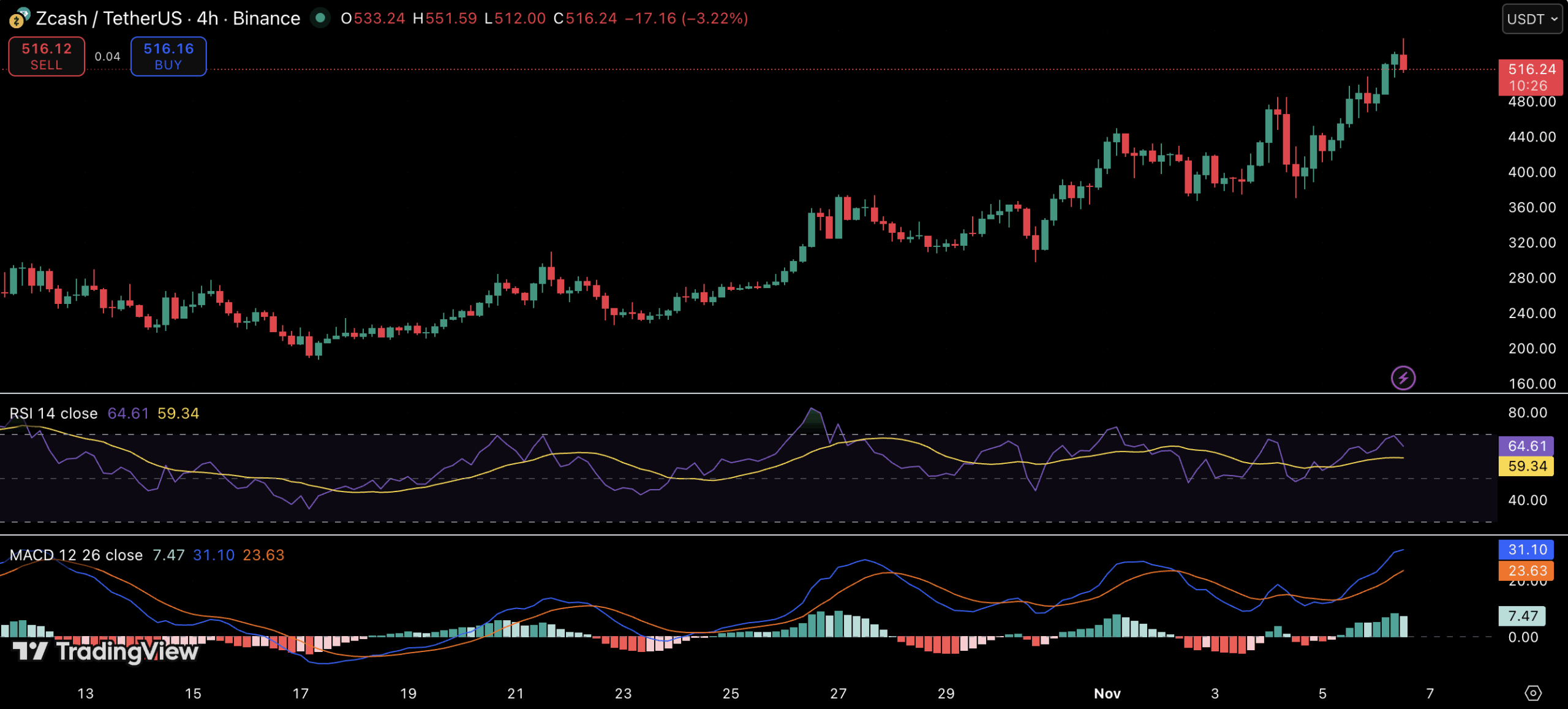 Zcash本周涨幅超56%,市值达84亿美元,跻身加密货币前20名。前BitMEX首席执行官Arthur Hayes看涨至1-2万美元,指出其屏蔽交易占比近30%及Halo 2升级消除信任设置缺陷的优势。11月即将到来的减半事件可能加剧供需反射效应。技术面显示,TD序列指标精准预测近期走势,4小时图RSI为64,MACD保持看涨势头。