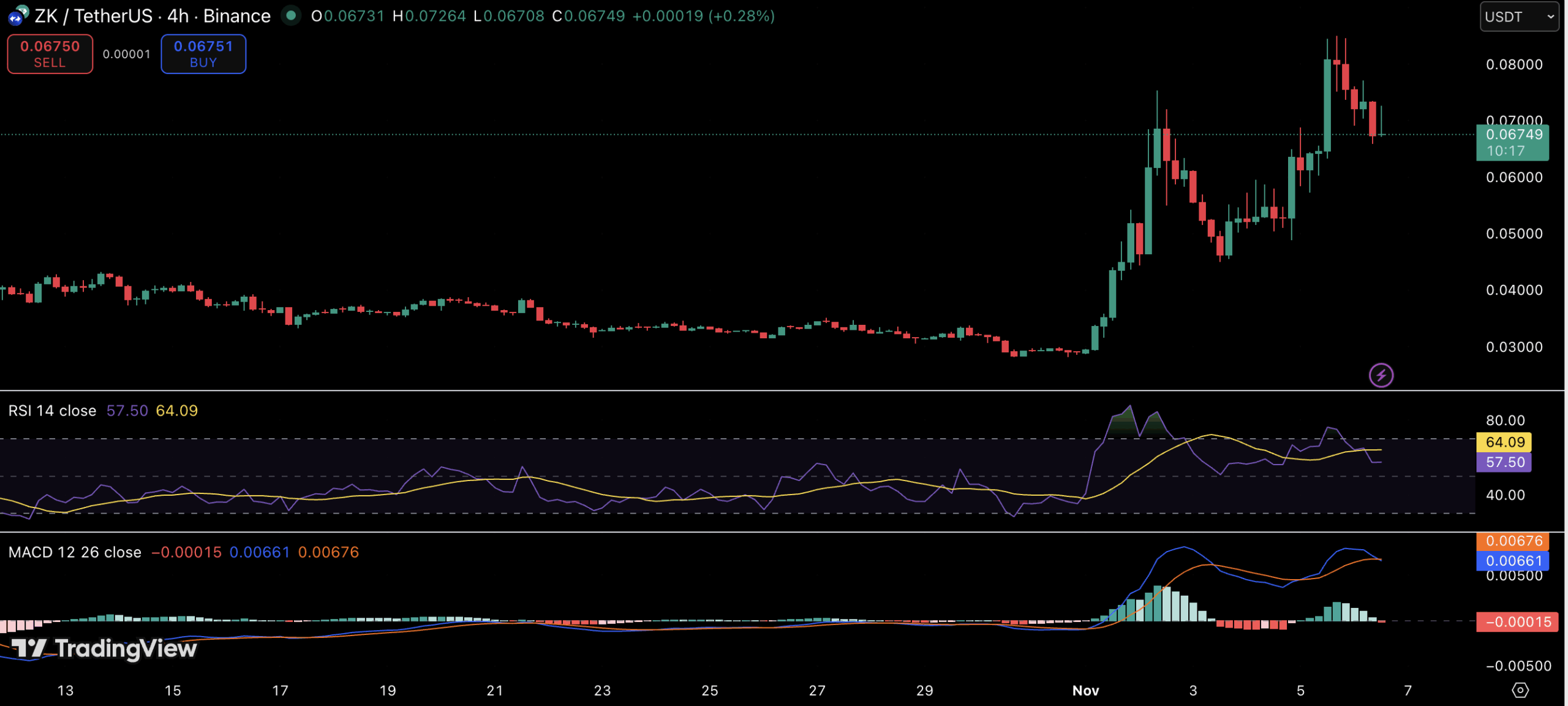 ZKsync通过代币经济改革及Atlas升级实现每秒1.5万笔交易、1秒最终确认的性能突破。联合创始人提出的"ZKnomics"将通过回购销毁、质押奖励形成生态正循环。尽管日内回调15%,ZK周涨幅仍达131%。分析师认为突破0.083美元后可能测试0.10-0.15美元区间,当前RSI57显示超买缓解,MACD维持微弱看涨信号。