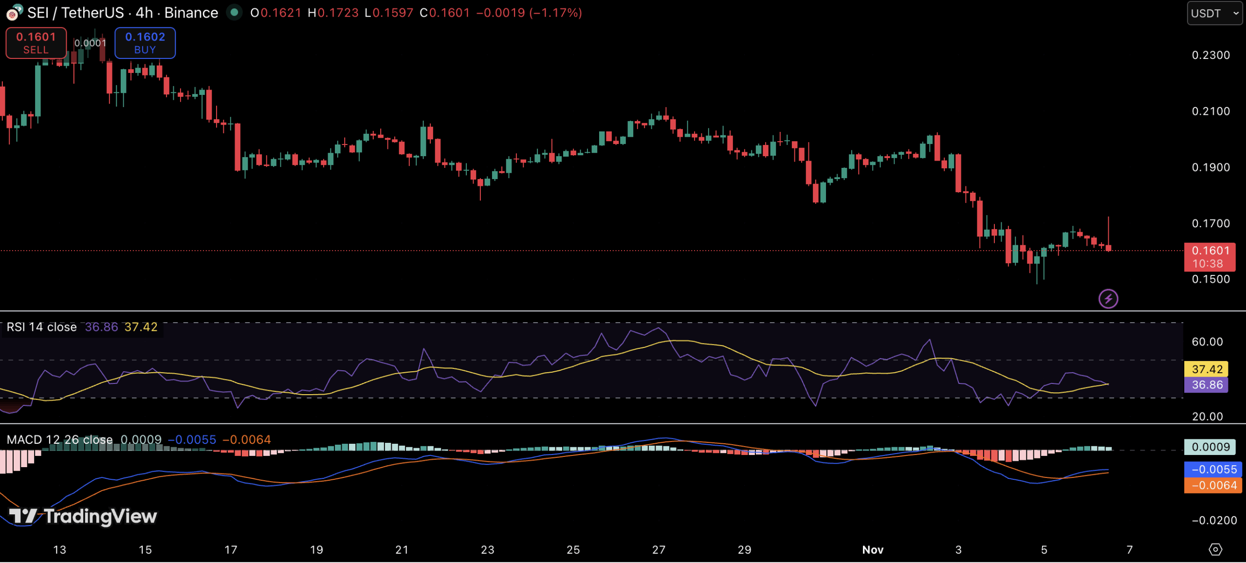 Sei Network登陆2500万用户的Robinhood平台,同时币安推出149万SEI锁仓高收益活动。尽管周跌13%至0.16美元附近,分析师发现0.15美元通道底部形成买入信号,反弹目标看向0.23-0.36美元。4小时图RSI37显示卖压减弱,MACD初现金叉形态。