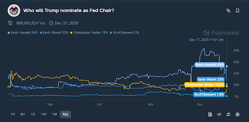 截至发稿时Polymarket数据显示,沃勒获选概率约为19%,沃什为23%,哈塞特则以54%领先。斯科特·贝塞特以2%的概率垫底。