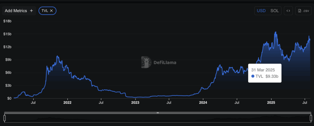 7月份Solana DeFi应用的活跃地址数增长12.3%,显示协议交互用户持续增加。与此同时,其总锁仓价值(TVL)从4月初的93亿美元飙升至7月底的134亿美元,三个月内实现44%的增长。这使Solana稳居DeFi公链第二位,仅次于以太坊但远超波场。