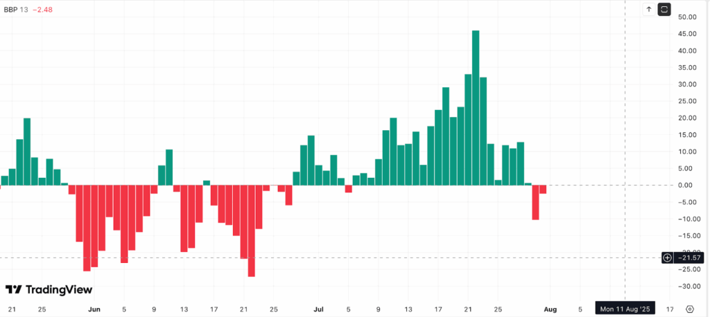 除交易量外,动量指标开始显示空方力量减弱。衡量买卖压力的牛熊力量指标(BBP)虽仍为负值,表明卖方暂居技术优势,但看跌强度正在消退——BBP正逐渐向中性靠拢。若买方加大力度,该指标可能转正,通常预示着新上升趋势的开始。