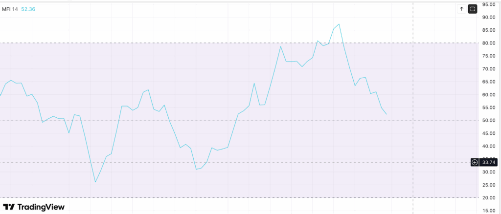 另一关键指标资金流量指数(MFI)数周来持续下降,显示资金流入大于流出。但目前该指数已稳定在52附近,表明资金外流放缓,新资金可能即将回归。若MFI突破60,将确认市场有新买盘进入。
