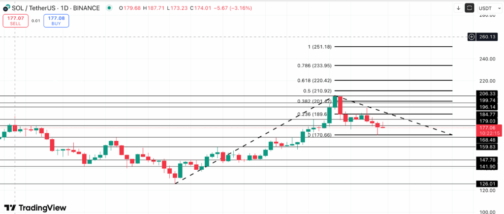 从技术面看,Solana价格昨日虽坚守170美元支撑位,但随大盘走弱已跌至169美元。若多头能将价格推升至189美元上方,下一目标将是206美元(前轮涨势的关键斐波那契回撤位)。突破该阻力后,价格或吸引更多买家并挑战250美元。
