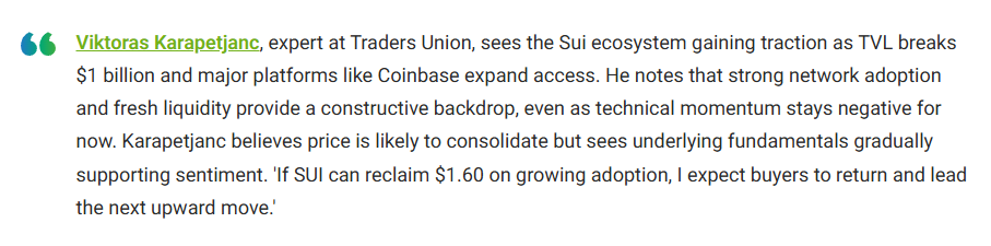 此外,Traders Union专家Viktoras Karapetjanc从基本面角度解释了价格突破技术阻力的原因:“若SUI能随着采用率增长收复1.60美元,预计买家将回归并引领下一轮上涨。”