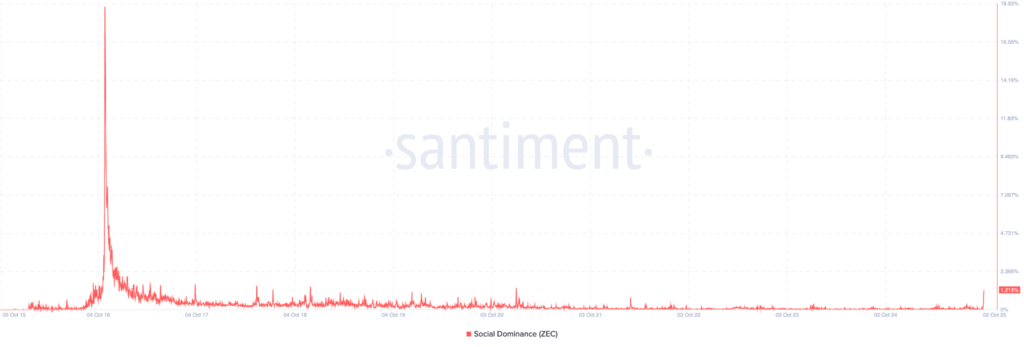 Santiment数据显示,ZEC社交主导率已攀升至1.21%的五年高位。该指标反映特定资产在加密社区讨论中的占比,暴涨往往预示着市场过度追捧和估值泡沫。