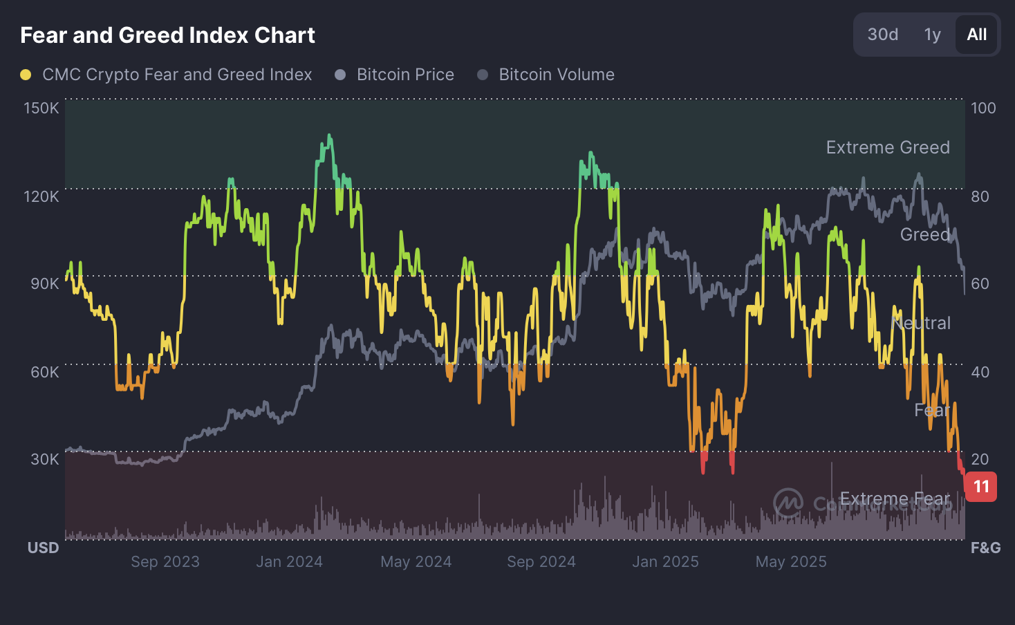 市场恐慌指数已骤降至11,深陷"极度恐惧"区域,这一心理水平通常与投降阶段相关联。与此同时,山寨币季节指数维持在26,证实资金正在逃离投机性资产并防御性转向比特币,尽管BTC自身也出现大幅回调。