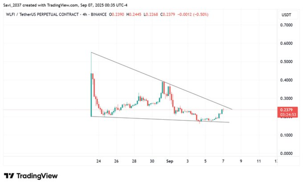 从4小时图观察,WLFI价格已形成楔形整理形态,阻力位在0.25美元附近。顶级分析师Crypto_Tigers1将其描述为上升三角形,通常预示着突破临近。