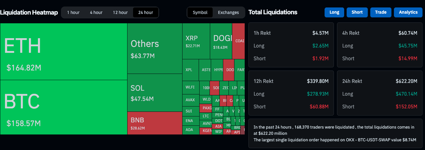 比特币昨日触及126,199美元历史高点后回落,以太坊亦从4,700美元上方下跌。加密市场24小时内爆仓金额高达6.22亿美元,其中ETH爆仓金额占比最大达1.65亿美元,BTC以1.59亿美元次之。