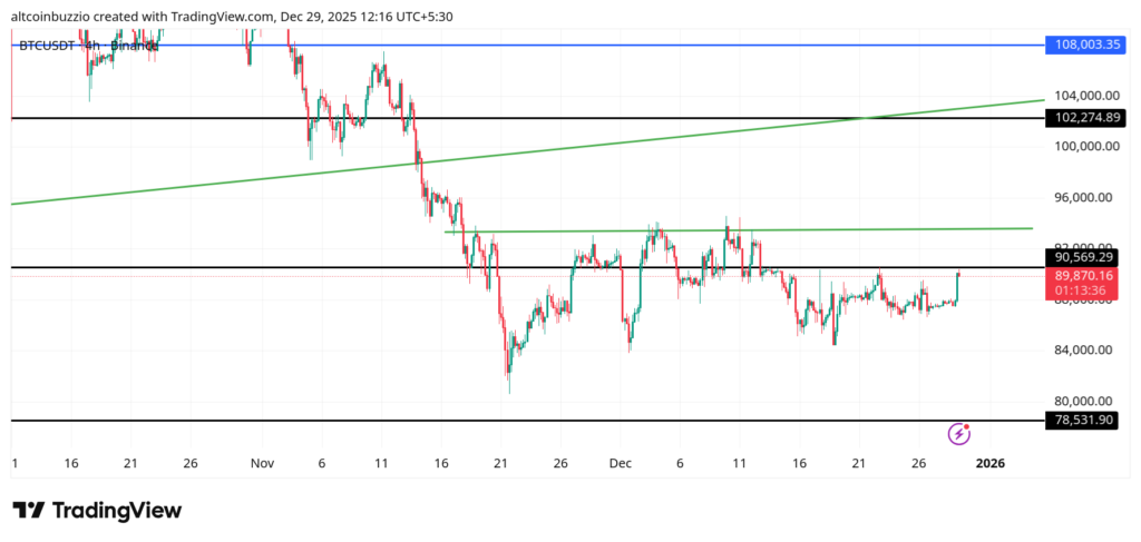 比特币处于平衡交易状态,价格被限制在坚固的阻力位和受保护的均线基础之间。波动性持续压缩。在市场重新扩张之前,88,001.8美元和91,627.3美元附近的反应将继续决定风险与机会。