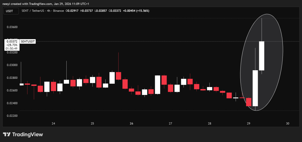 感知币(SENT)价格今日大幅上涨,在整体市场动荡的背景下表现突出,从而吸引了广泛关注。感知币价格从早盘接近0.024美元的低点攀升了约50%,打破了近期交易时段形成的短期下跌压力。这一势头突然出现,自然引发了市场对其背后原因以及买家为何果断入场的疑问。